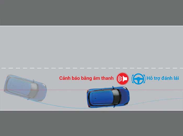 Hệ thống nhận diện vạch kẻ đường và dự đoán hướng xe. Nếu phát hiện xe có dấu hiệu lệch làn ngoài ý muốn, hệ thống cảnh báo âm thanh hoặc rung vô-lăng, sau đó hỗ trợ đánh lái để xe quay lại đúng vị trí.